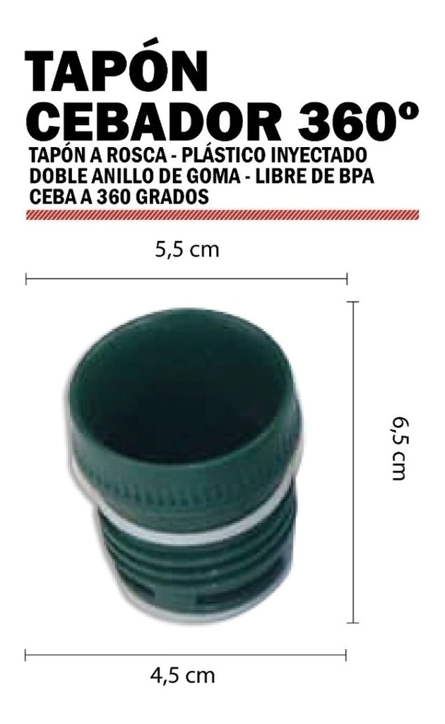 Tapon a rosca, con doble anillo de goma, ceba a 360 grados y no pierde ni chorrea, calze perfecto con el mismo diseño del tapon cebador Stanley.